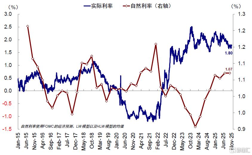 图表:美国自然利率在1.1%左右,实际利率接近1.8%,3次降息可解决二者70bp的差距
