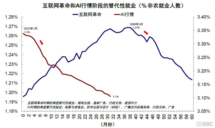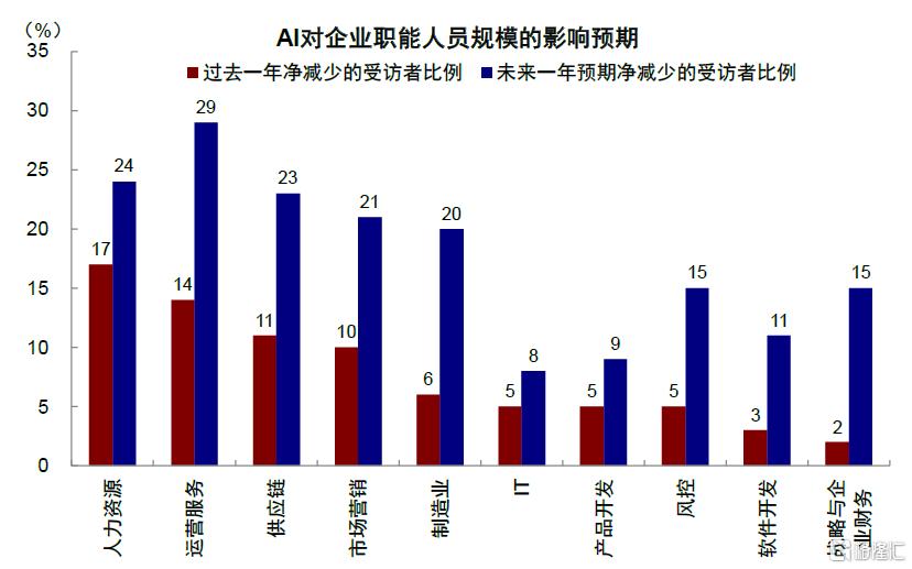 当然,效率提升的一个“连带伤害”会造成部分就业的减少。1995~2000年个人计算机和互联网的普及,对传统出版、人工数据录入等流程化岗位形成明显替代,Windows 98的面世也进一步加剧了替代效应,包括行政支持、报纸出版等受影响明显的行业就业人数占比在1998年3月达到1.27%后持续回落至1.21%。AI技术对就业的替代作用更快、范围更广。AI技术不仅影响传统的重复性工作岗位,还延伸到软件开发、广播、电影与录音以及广告等内容生成式的初级岗位,受影响的就业人数占比从2023年开始的3.3%持续回落至2025年8月的3.1%。根据麦肯锡的最新调查显示[4],未来一年预期AI会继续加剧企业职能人员净减少的受访者占比在增加,人力资源、运营服务、供应链等行业的比例升至20%以上。