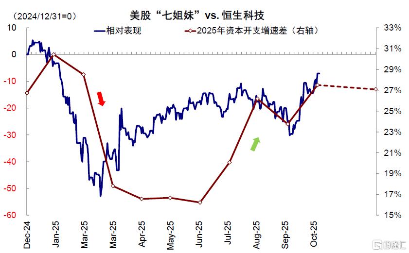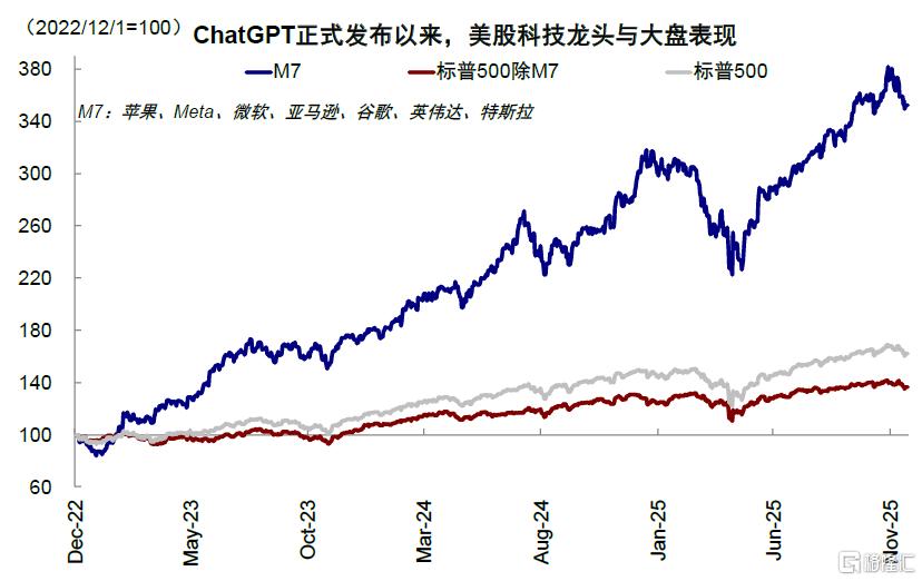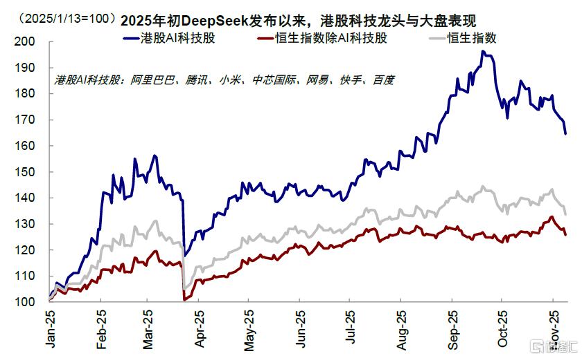 虽然与此同时,美国政府关门、回购市场流动性紧张、美联储降息预期降温,国内数据转弱也都来“凑热闹”,压制了风险偏好,但AI泡沫担忧才是最核心的问题,毕竟这是当下中美三地市场最主要的景气方向之一。例如,从2022年底ChatGPT发布以来,美股“七姐妹”最高上涨283%,大幅跑赢同期标普500指数扣除M7后的69%;中国市场也是如此,2025年初DeepSeek发布以来,中国科技“十巨头”最高上涨81%,大幅跑赢恒指扣除“十巨头”后的19%,年化表现甚至一度超过M7。可见,不论是市场表现、还是信用周期,AI趋势都牵一发而动全身,一荣俱荣、一损俱损(《2026年展望:跟随信用扩张的方向》)。