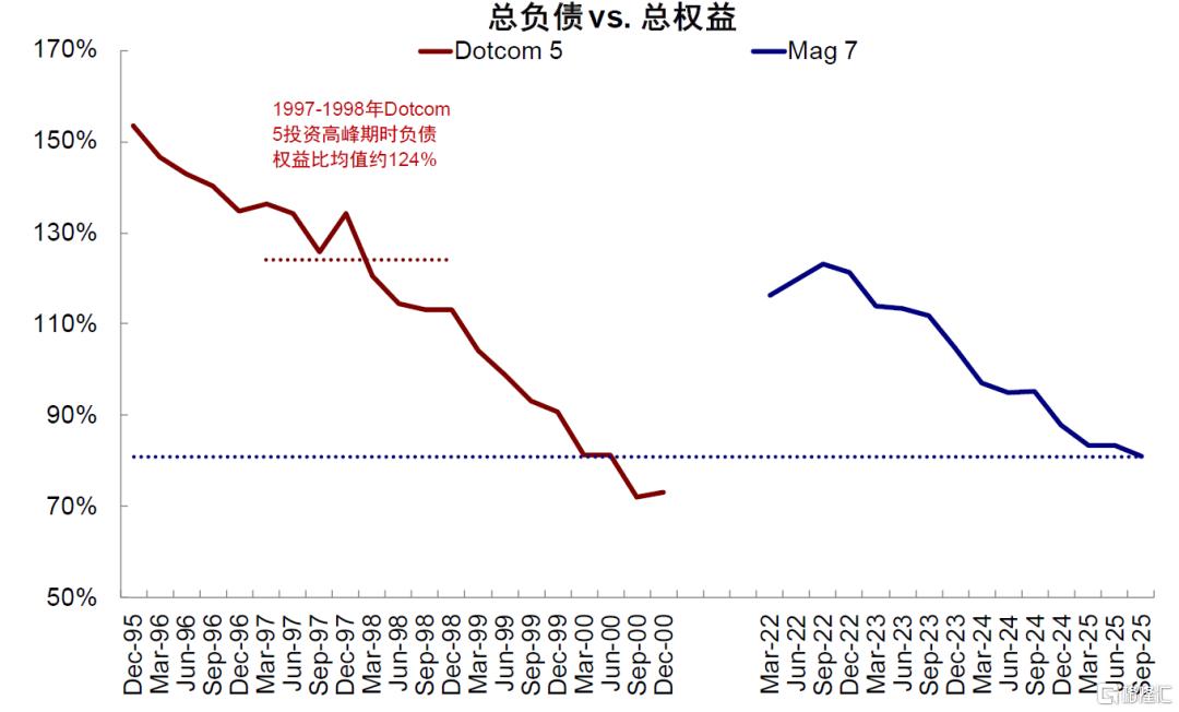 从存量视角看,观察杠杆率水平,“债务高企”时依赖债务融资与杠杆率相对健康时启动债权融资的含义相去甚远。目前Mag 7的负债权益比(3Q25约81%)大幅低于Dotcom 5投资高峰期(约1997-1998年)水平(均值约124%)。尽管当前有迹象显示部分企业或开始启动债务融资以投资AI,一个较低的初始杠杆水平或仍说明其债务依存情况相对互联网泡沫时期仍较低。
