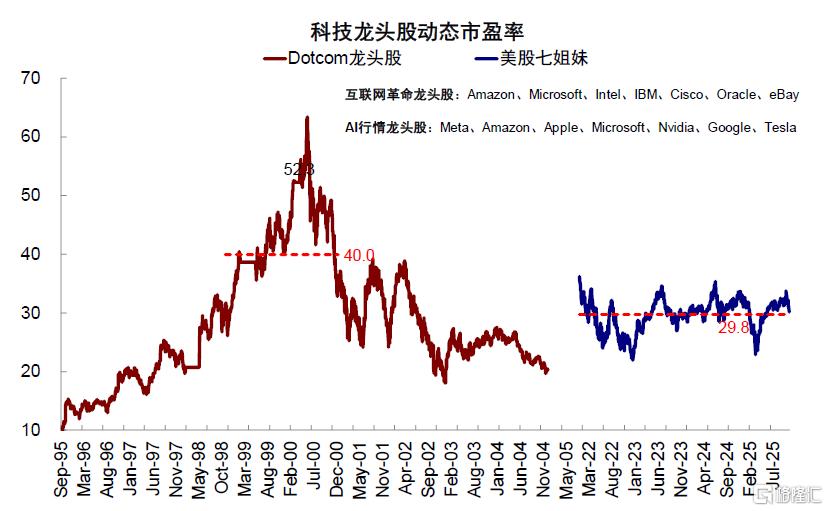 二级市场估值接近1998年底水平。“美股七姐妹”动态市盈率10月底攀升至33倍左右的高位,逼近2024年7月35倍的高点,但仍显著低于“互联网泡沫”时期“非理性”的60倍。近期伴随美股调整,“美股七姐妹”动态市盈率回落至28倍左右,与1998年11月的水平近似。