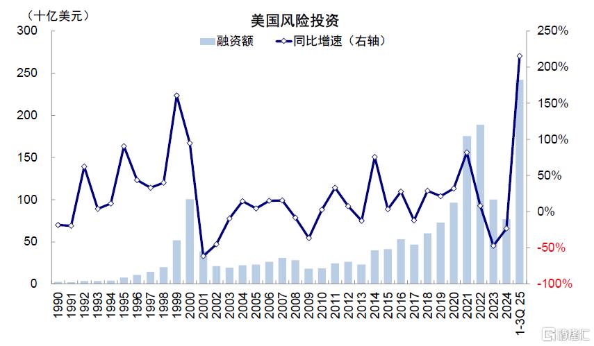 图表:美国2025年前三季度风险投资规模相比2023年AI产业兴起时抬升1.4倍
