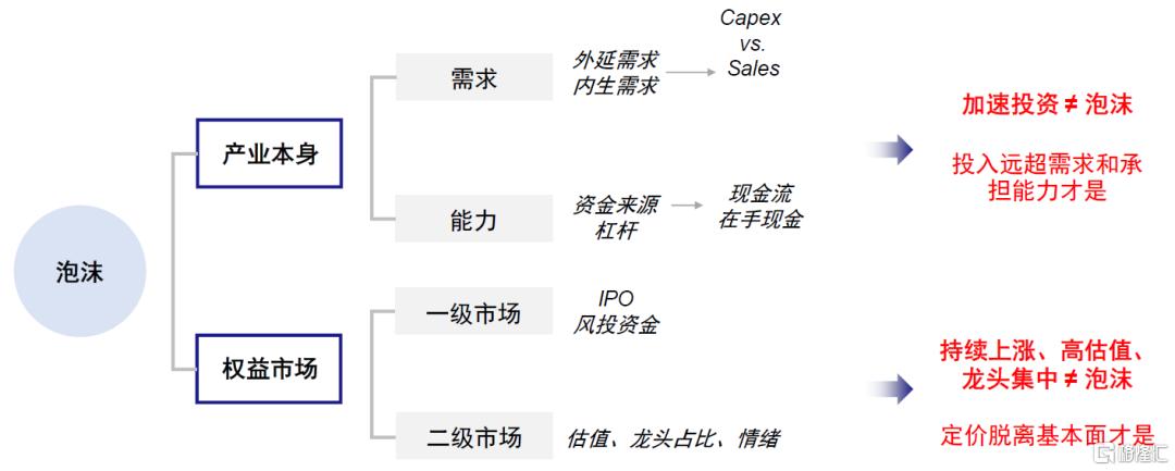 如何有效地判断泡沫?加速投资不是泡沫,远超需求和能力才是;持续上涨、高估值和龙头集中也不等同于泡沫,超过价值才是