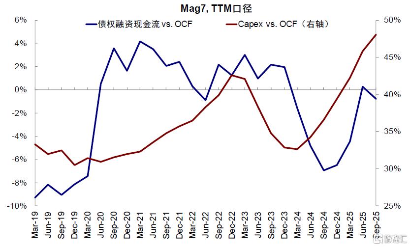 图表:截至目前,本轮行情中Mag 7债券融资现金流和资本开支边际变化间没有明显相关性