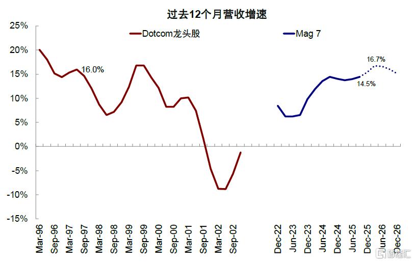 从结果上看,AI龙头至少已经开始有了可观规模的营收,且仍在加速。“美股七姐妹”营收同比增速自2023年三季度持续抬升至当前的14.5%,2026年一季度预期上行至17%后小幅回落至15~16%,从增速和走势角度表面上更类似于1997年。但在资本开支不断上行的背景下,营收的强劲增长能否进一步打开空间是市场焦点和分歧所在,也是估值一直存在天花板的原因。