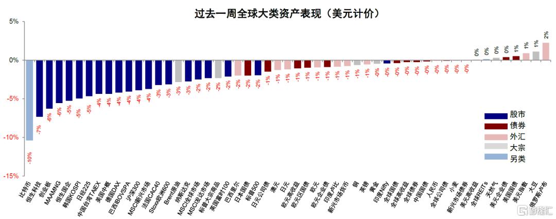 图表:过去一周全球大类资产表现中,比特币、恒生科技、创业板以及“美股七姐妹”领跌