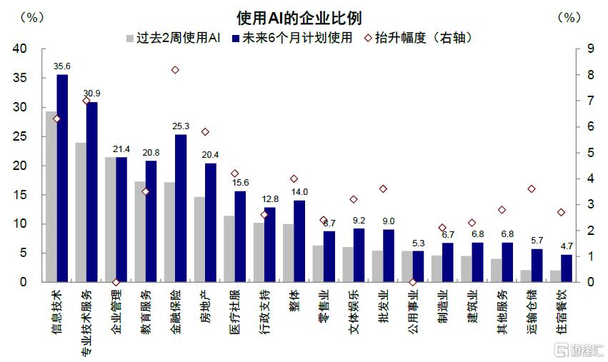 ► 外延创新需求:这个是AI应用能否突破到更广范围的关键,也是市场最大的分歧所在。新技术能否转化为需求的前提之一取决于其普及率提升的速度和深度,生成式AI技术普及率自ChatGPT发布以来已经升至79%,速度远超此前个人电脑和互联网技术达到这一水平需要的22年和12年,至少说明当前AI有较大的熟悉程度和“群众基础”,才能有突破的可能。除了信息技术行业外(29%),专业技术服务(24%)、企业管理(21%)等行业使用AI技术的企业比例领先,住宿餐饮和运输仓储使用率不足1%。但在未来6个月的预期调查中,基本所有行业的使用比例均有增加,其中金融保险(8.2ppt)、专业技术服务(7ppt)、房地产(5.8ppt)、医疗社服(4.2ppt)等行业的抬升幅度领先,后续的关键可能更要看在非科技和专业技术领域如服务业的渗透程度。