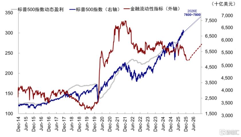 对于美股整体,基准情形下,中金判断基本面修复逻辑支撑美股上涨,短期波动不改长期趋势(《2026年展望:跟随信用扩张的方向》)。信用周期走向修复甚至过热,有助于推动美股盈利继续上修,或将继续推动美股上涨。此外,金融流动性历史上和美股有较好相关性,2026年基准情形下美联储停止缩表、甚至开始扩表,金融流动性的扩张对美股也有提振作用。中金预测2026年底标普500指数或在7600~7800,涨幅空间13~16%。