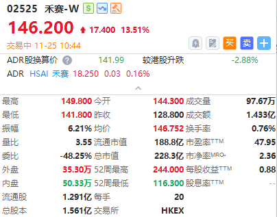 禾赛-W涨近14%,截至发稿,涨13.51%,报146.2港元,成交额1.43亿港元。