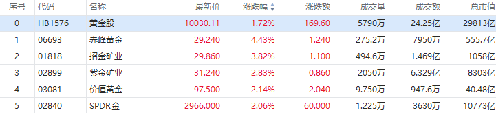 华盛资讯11月25日讯,港股黄金股普涨,赤峰黄金涨超4%,招金矿业涨超3%,紫金矿业涨超2%。