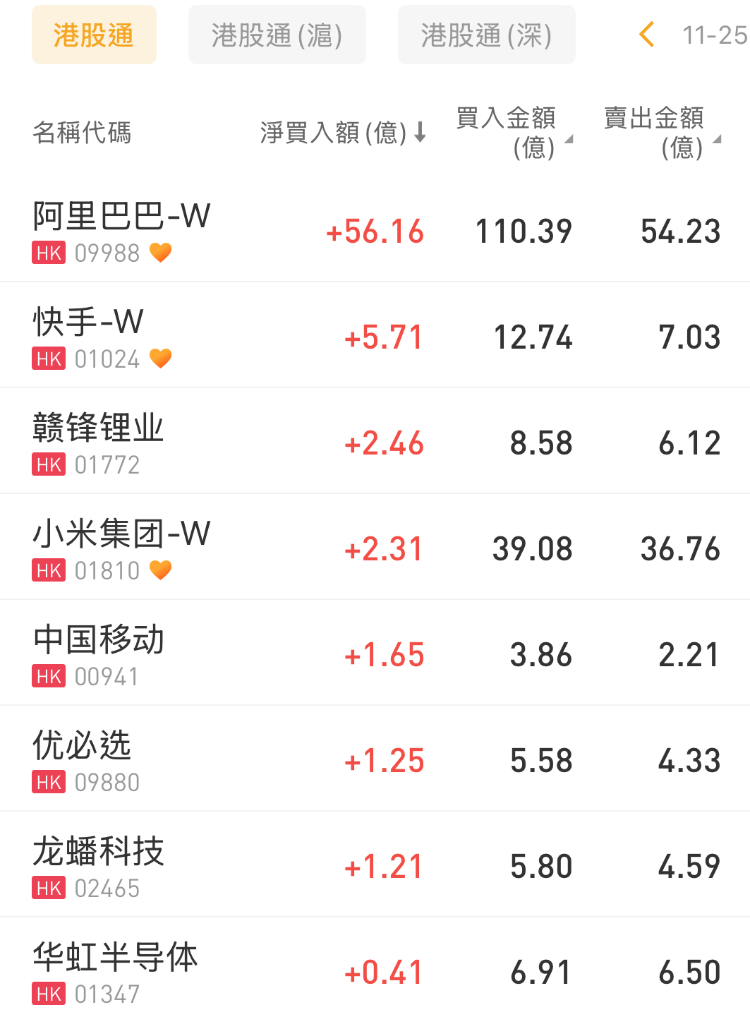 阿里巴巴-W、快手-W、赣锋锂业分别获净买入56.16亿港元、5.71亿港元、2.46亿港元。