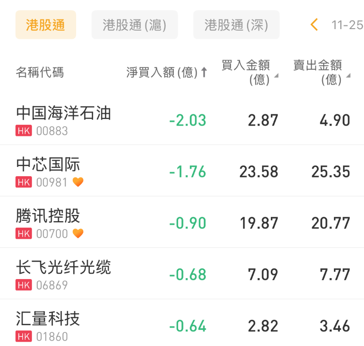 中国海洋石油、中芯国际、腾讯控股分别遭净卖出2.03亿港元、1.76亿港元、8998万港元。