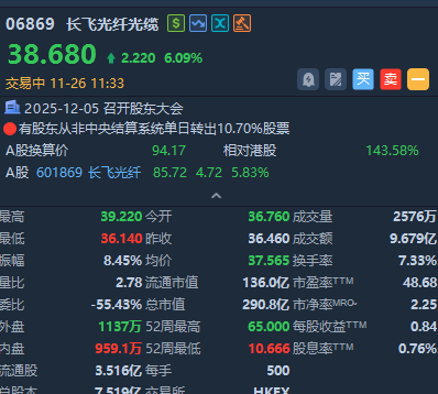 智通财经APP获悉,长飞光纤光缆盘中拉升,截至发稿,涨超6%,报38.68港元,成交额约9.7亿港元。