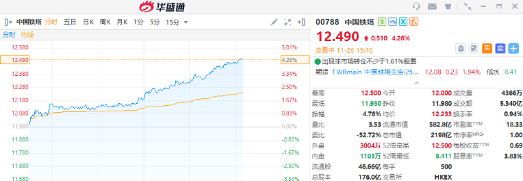 中国铁塔涨幅扩大逾4%,截至发稿,涨4.26%,报12.49港元,成交额5.34亿港元。
