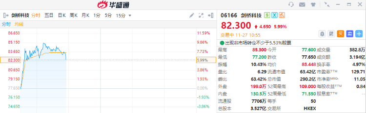 剑桥科技早盘一度涨近10%,截至发稿,股价上涨5.99%,现报82.3港元,成交额3.19亿港元。