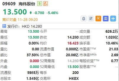 华盛资讯11月28日讯,港股海伟股份今日挂牌,截至发稿跌5.46%,报13.50港元/股,中签一手账面浮亏156.0港元,最新总市值超20.86亿港元。该股此前公开发售获5426.27倍认购,一手中签率1.0%。