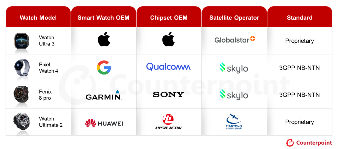 来源:Counterpoint Research 全球智能卫星手表 NTN 追踪