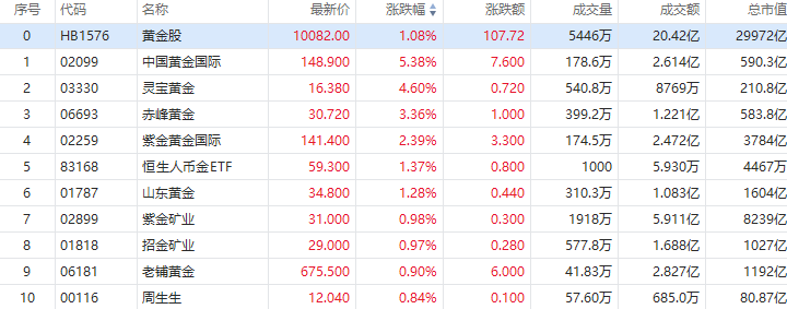 今日港股黄金股表现亮眼。截至发稿,中国黄金国际涨超5%,灵宝黄金涨超4%,赤峰黄金涨超3%,山东黄金涨超1%。