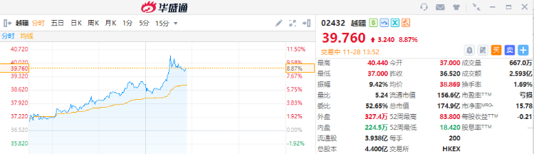 越疆早盘涨近4%,截至发稿,涨近9%,报39.76港元,成交额2.59亿港元。