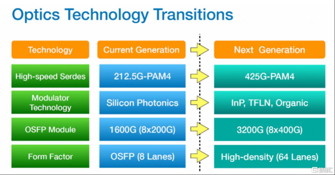 其中,Arista讨论了下一代400G代际光学互连技术,阐述了光侧接口需要PAM4调制来达成较好的OSNR,电侧接口需要优化PAM4 SerDes来达成系统最优,因为如果电侧接口为PAM6调制,则额外需要一个高功耗的Gearbox。另外对于光侧的调制技术,传统SiPh受限于带宽也需要InP、TFLN等调制技术。