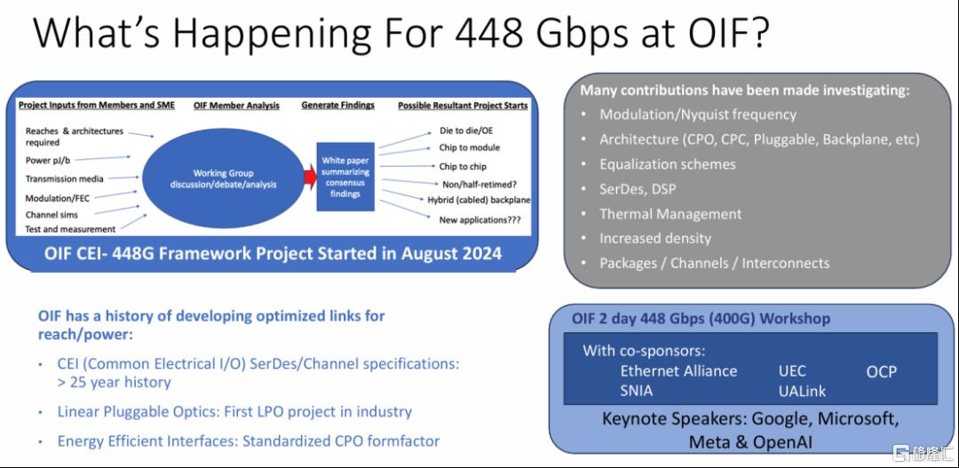 为避免技术分歧、凝聚行业共识,OIF还联合以太网联盟、SNIA、OCP等组织举办448Gbps专项研讨会,谷歌、微软、Meta、OpenAI等AI巨头纷纷分享需求痛点,推动技术路线向实际应用落地倾斜。