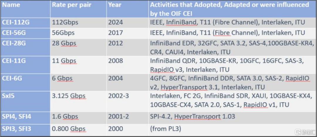 其中,作为行业核心推动力量,OIF自2000年推出0.8Gbps的SPI3/SF13标准以来,始终引领着下一代数据速率的研发方向,构建了从低速到高速的完整技术演进路径。从2004年6Gbps、2008年11Gbps,到2012年28Gbps、2017年56Gbps,再到2024年112Gbps,每一代技术都被IEEE、InfiniBand、T11等主流行业组织采纳,成为全球互连领域的事实标准。