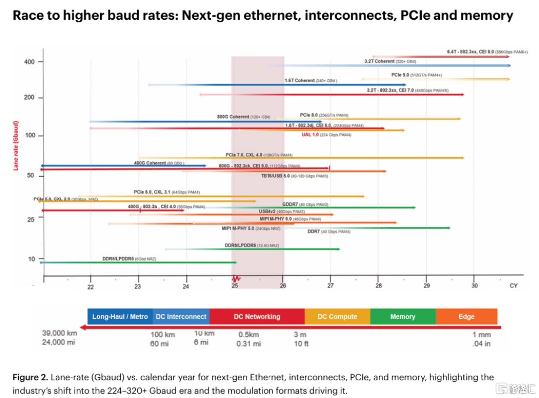 能够发现,数据传输技术从早期Gbps级迭代至448G/lane,大概每几年速率翻倍实现翻倍。目前,112/224Gbps技术已在超大规模数据中心、AI 训练集群、自动驾驶等关键应用场景中得到广泛部署,成为支撑数字经济发展的基础设施技术。