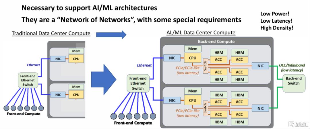 相较于传统数据中心的架构形态,AI/ML数据中心是典型的“网络之网”,其架构复杂度与传输需求已发生质变。如上图所示,AI数据中心前端虽仍由以太网交换机连接NIC与CPU,但CPU会通过低延迟的PCIe/类PCIe接口对接内部交换机,进一步关联搭载HBM的加速器(ACC)集群;后端更引入UEC/InfiniBand这类低延迟链路,串联起不同计算单元与后端交换机。