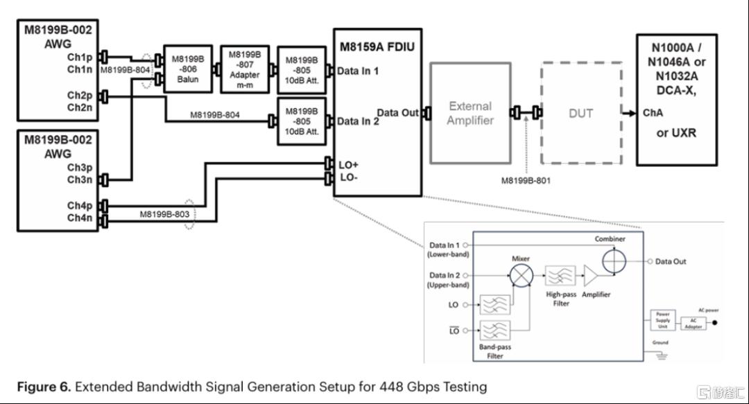 另外,测试设备厂商率先突破技术瓶颈。是德科技推出的M8199B系列任意波形发生器(AWG),通过频域交织技术(FDIU)将带宽扩展至120GHz以上,支持224Gbaud PAM4、174Gbaud PAM6和150Gbaud PAM8等多种调制格式的448Gbps信号生成,其优化方案在224Gbaud下仍能维持20.5dB的高信噪比,为技术研发提供了关键的测试验证支撑。