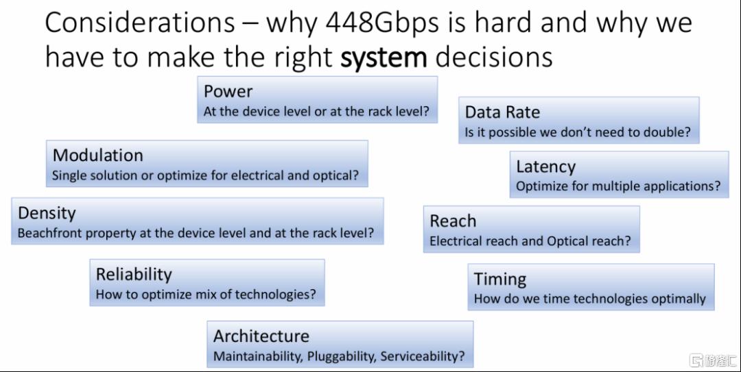 此外,可靠性的技术组合优化、数据速率是否必须强制翻倍、延迟如何适配多应用场景、电/光传输距离的平衡、技术落地的时序规划,以及架构的可维护性与可插拔性,每一项选择都牵一发而动全身,直接影响 448Gbps 系统的经济性与可行性。