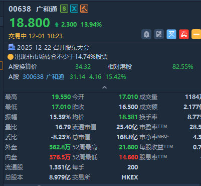 广和通一度涨超17%,截至发稿,涨近14%,成交额超2.17亿港元。