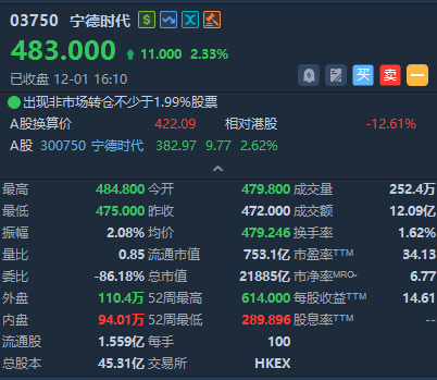 12月1日,宁德时代港股尾盘拉升,收于483元/股,涨幅为2.33%,总市值为2.19万亿港元。