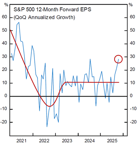 美国经济处在一种典型的“弱平衡”状态:不是高歌猛进,但也远没有到衰退门口。盈利端的数据相当亮眼——三季度超过八成标普成分股业绩超预期,混合口径 EPS 同比增速在 13% 左右,未来 12 个月的盈利指引预期接近 30%,与以往几轮熊市起点“盈利已见顶、预期全面下修”的情形完全不同。