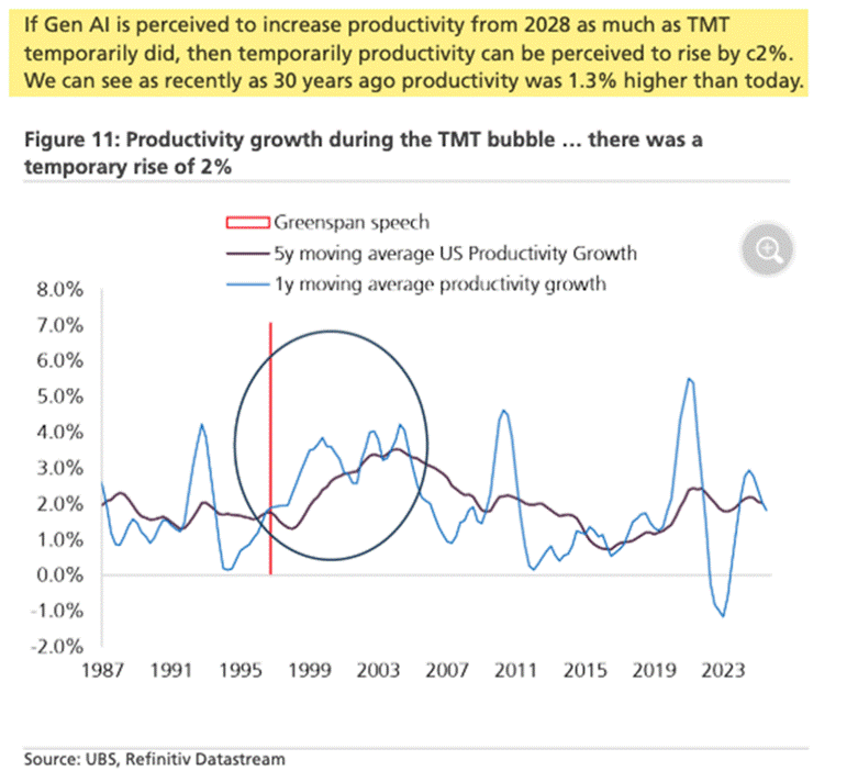 图1:类比1990年代,当前AI对生产率的提升甚至还没开始,也就是说,非要硬比,现在也很难说是泡沫后段。