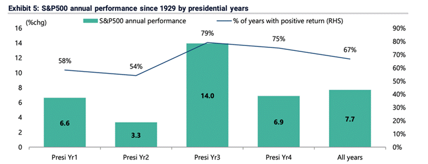 然而,历史上的中期选举年份,无论美国的执政党怎么努力,似乎美股的平均收益都只有个位数。自 1929 年以来,总统任期第二年(中期选举年)是标普平均表现最差的一年,平均涨幅约 3%,正收益概率也明显低于其他三年。