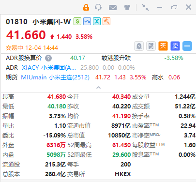 此外,小米集团公告称,12月3日,公司斥资3.02亿港元回购750.00万股。值得注意的是,自11月28日以来公司已连续4日进行回购,合计回购2700.00万股,累计回购金额10.93亿港元。