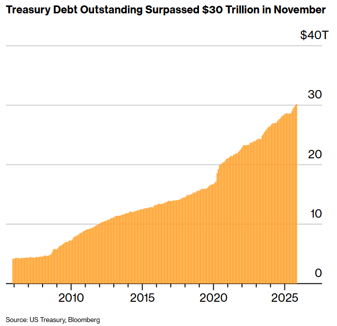 美国国债市场规模首次突破30万亿美元——自2018年以来规模已翻倍有余,疫情时期的借贷激增正产生持续影响。