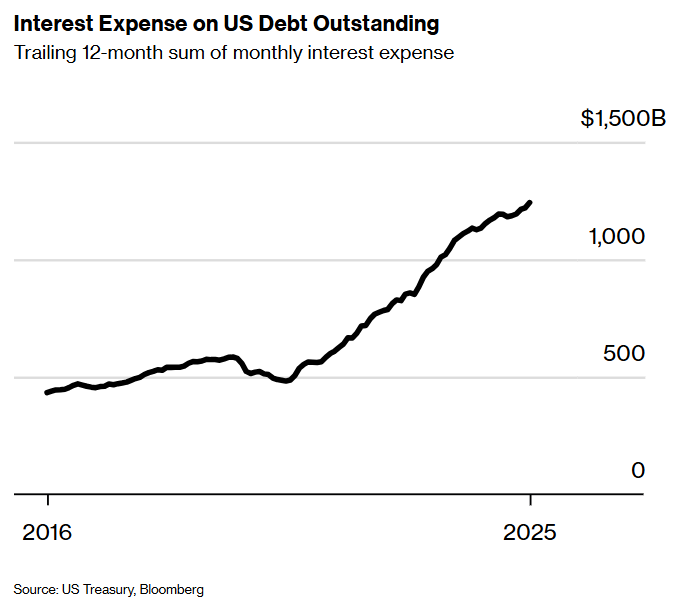 根据证券业和金融市场协会的数据,2020年美国通过发行国债借贷了4.3万亿美元,当时赤字超过了3万亿美元。尽管此后赤字有所收缩——很大程度上归因于今年美国对许多进口商品征收的关税带来的收入,在2025财年最新赤字已降至约1.78万亿美元,但债务的付息成本高达1.2万亿美元。