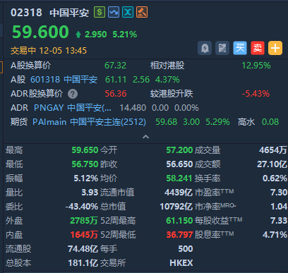 华盛资讯12月5日讯,内险股午后继续走强,截至发稿,中国平安涨超5%,中国太平涨超4%,中国太保、中国人寿、新华保险涨超3%。
