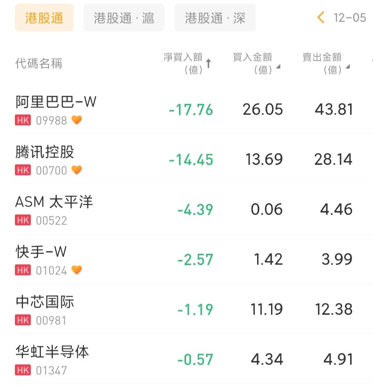 阿里巴巴-W、腾讯控股、ASM 太平洋分别遭净卖出17.76亿港元、14.45亿港元、4.39亿港元。