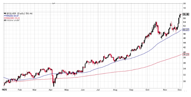 这次看起来确实不同。 白银于10月3日触及48美元,并在接下来的一周首次收于50美元上方。它在48美元附近短暂盘整,多次试探这一水平,然后近几周再次起飞。