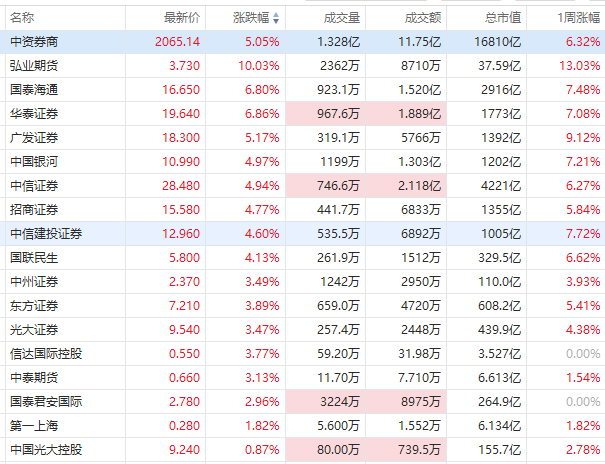 华盛资讯12月8日讯,港股市场中资券商股涨幅居前,其中,弘业期货大涨超10%,国泰海通、华泰证券涨近7%,广发证券、中国银河、中信证券、招商证券涨约5%,东方证券、光大证券涨超3%。