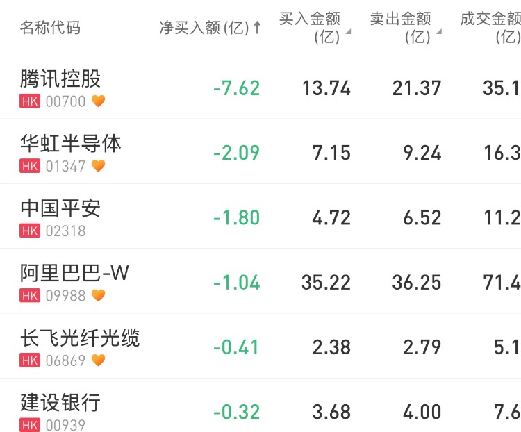 腾讯控股、华虹半导体、中国平安分别遭净卖出7.62亿港元、2.09亿港元、1.8亿港元。