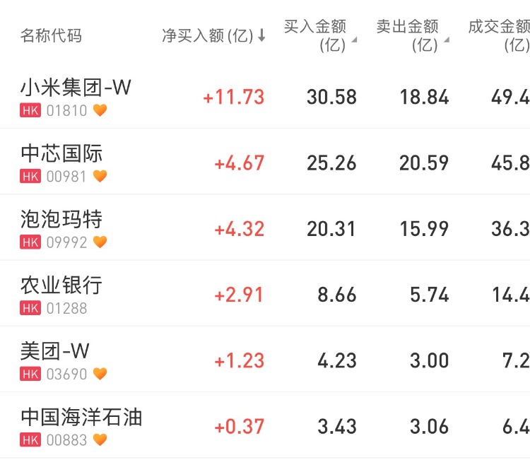 小米集团-W、中芯国际、泡泡玛特分别获净买入11.73亿港元、4.67亿港元、4.32亿港元;