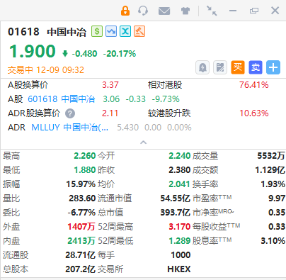 中国中冶股价重挫逾20%,截至发稿,跌20.17%,报1.9港元,成交额1.129亿港元。