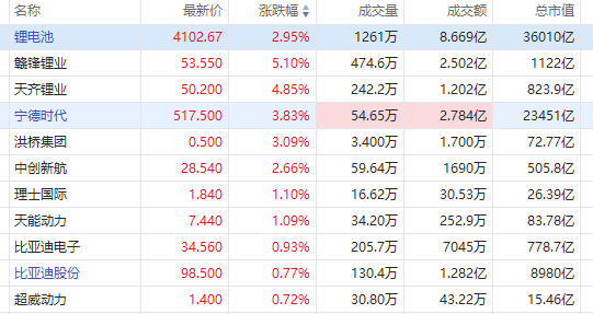 港股锂电股延续涨势,天齐锂业涨超5%,宁德时代、赣锋锂业均涨超3%,比亚迪股份涨近1%。