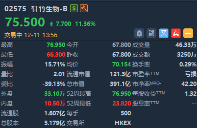 轩竹生物-B午后快速拉升超11%,股价创历史新高,成交额超3250万元。