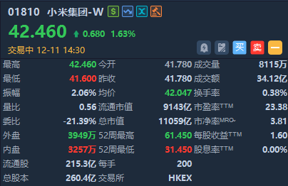 华盛资讯12月11日讯,小米集团午后逆势拉升,截至发稿,涨超1.6%,成交额超34亿港元。