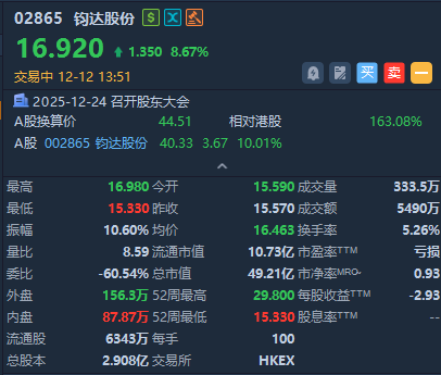 钧达股份午后涨超8%,报16.92港元,成交额3927.96万港元。