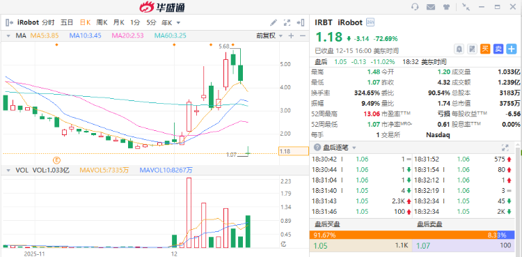 即便在那样的公告发布后,受到“特朗普政府有意推动机器人技术发展”的消息刺激下, iRobot在12月3日单日暴涨73%,而在周末破产公告前本月累计涨幅达到173%。